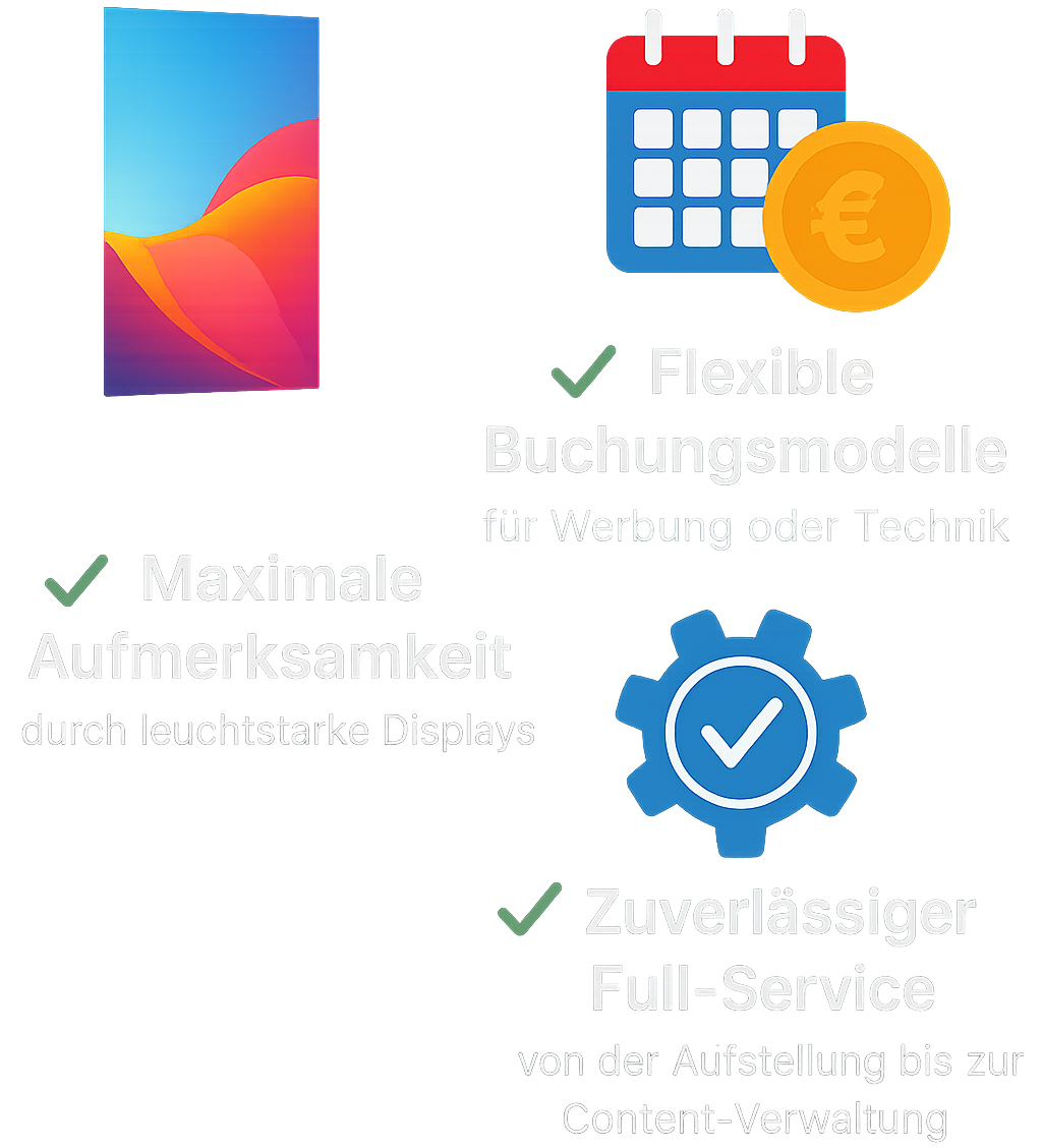 Ob Sie selbst Werbung schalten oder eine Displaylösung mieten möchten – wir bringen Ihre Botschaft groß raus.